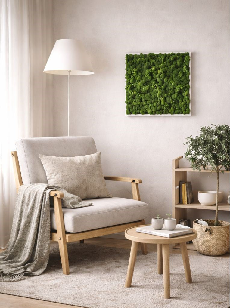 Unsere Moosbilder bestehen zu 100% aus echtem, natürlichem Moos. Es wird geerntet, gereinigt und durch ein schonendes Konservierungsverfahren haltbar gemacht. Dadurch entfallen jegliche Folgekosten wie Pflege und Erhaltung. Wir liefern die Produkte inkl. hochwertigem Rahmen und Befestigungsset.