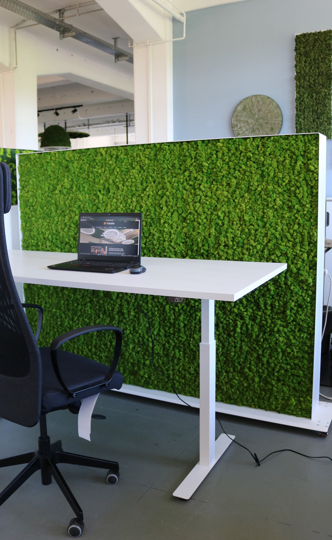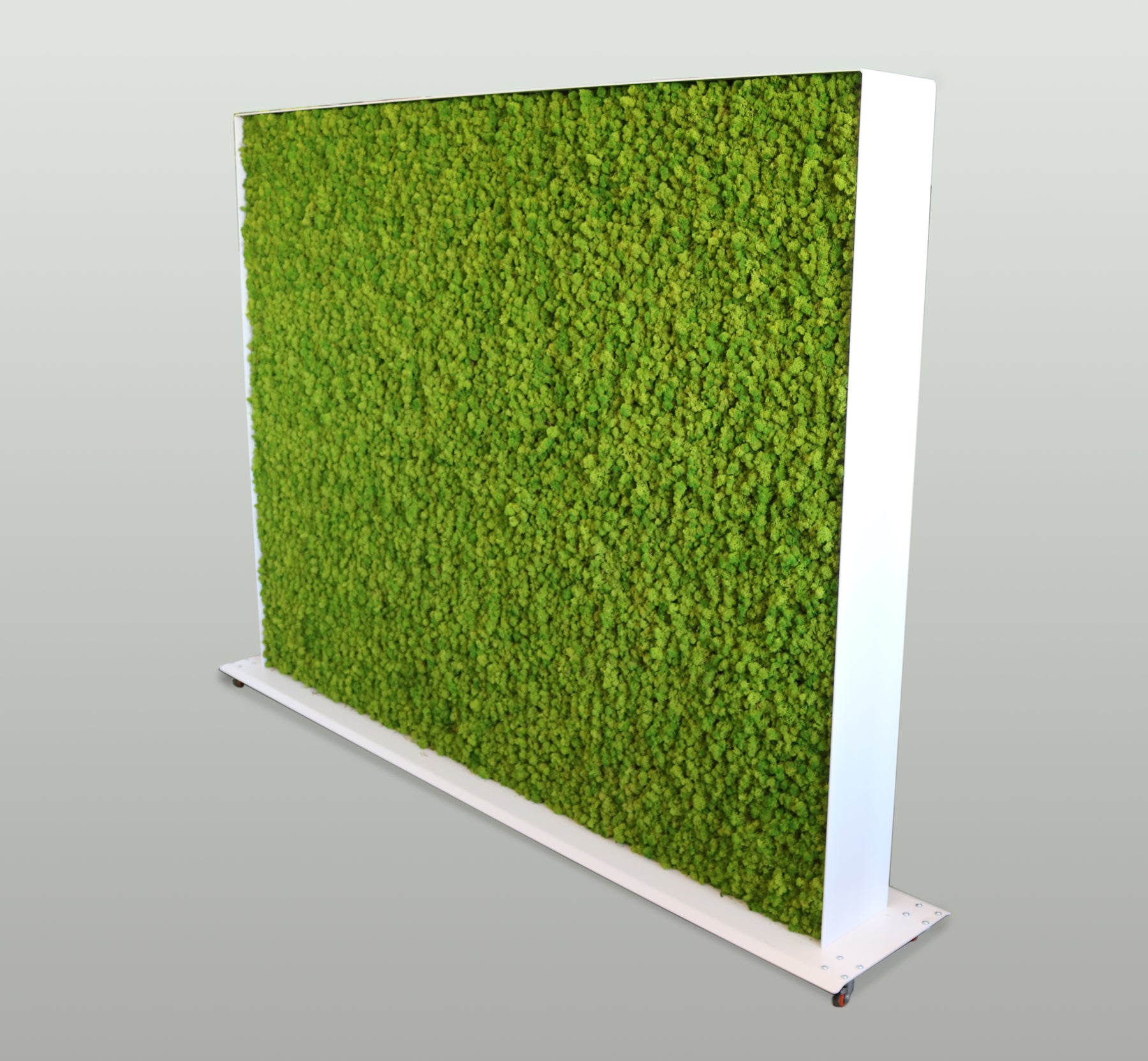 Islandmoos Raumteiler auf Stahl Unterkonstruktion (weiß, pulverbeschichtet) mit Rahmen und Rollen